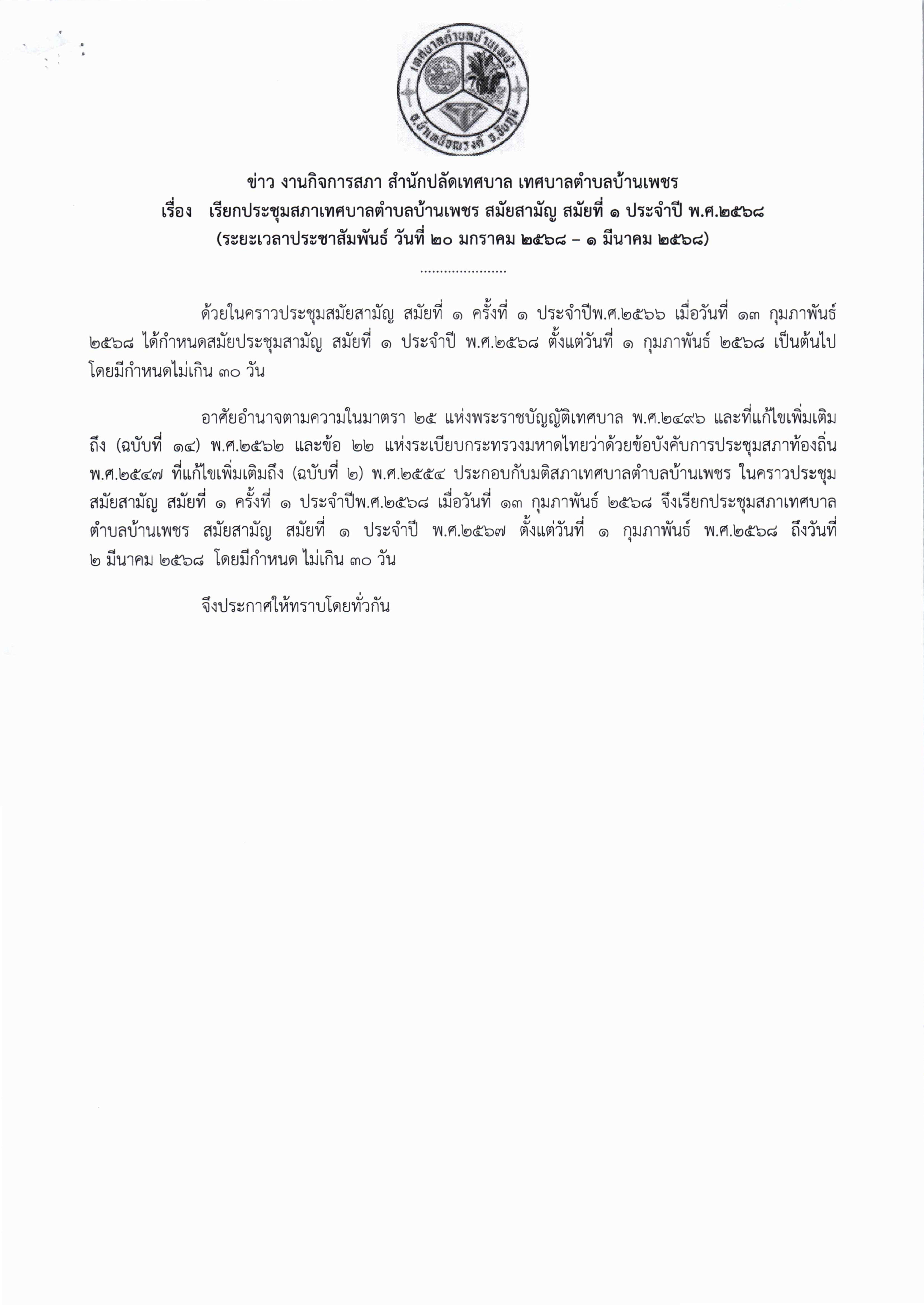 ข่าว-การเรียกประชุมสภาเทศบาลตำบลบ้านเพชร สมัยสามัญ สมัยที่ 1 ประจำปี พ.ศ.2568