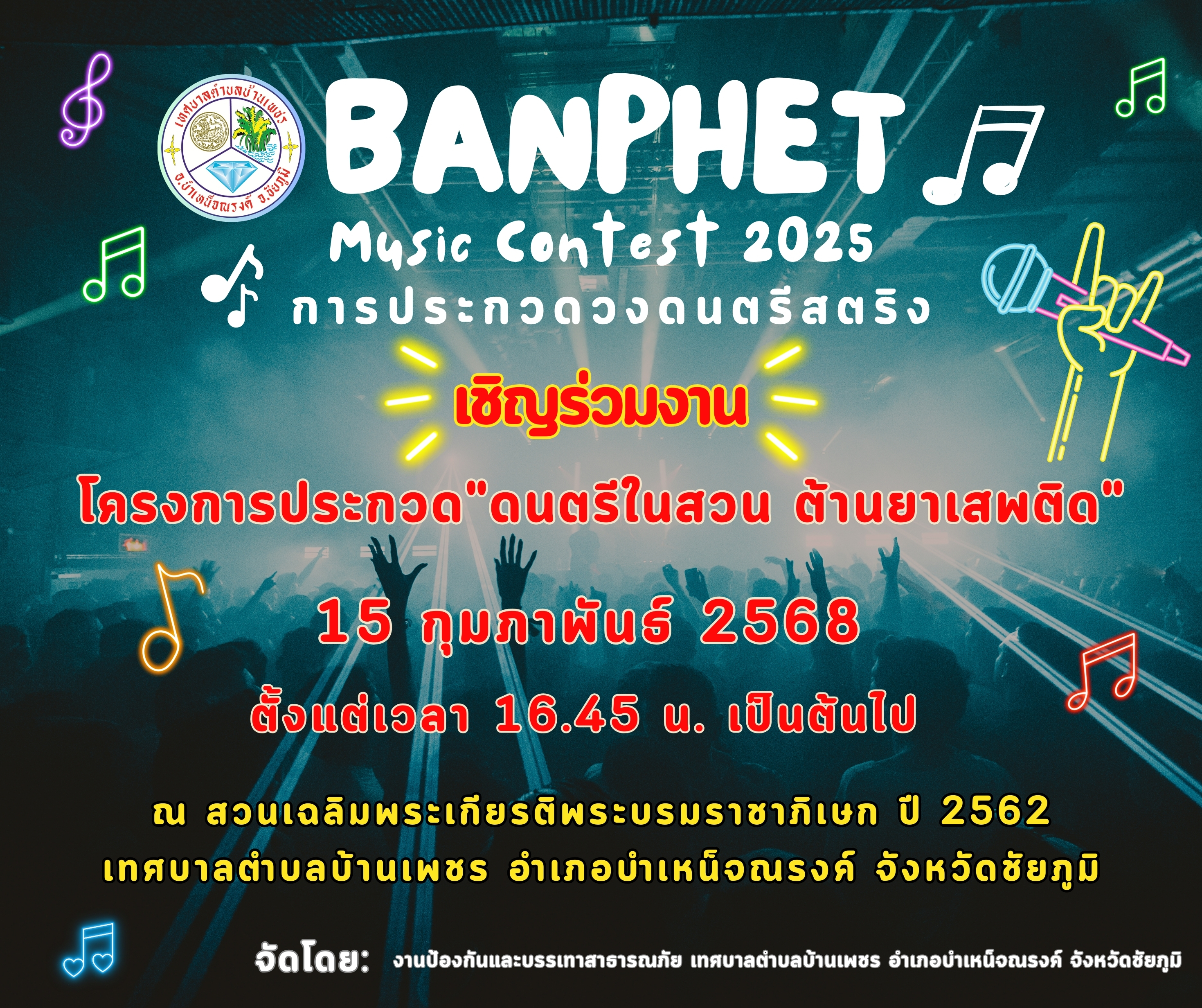 เพื่อเป็นขวัญและกำลังใจให้แก่ ผู้เข้าประกวดวงดนตรีสตริง โครงการประกวด“ดนตรีในสวน ต้านยาเสพติด” ในครั้งนี้ จึงขอเชิญชวนพี่น้องประชาชนมาร่วมรับชมและเชียร์ ทีมที่ส่งเข้าแข่งขันทั้งหมดจำนวน ๑๘ ทีม ซึ่งมาจากหลากหลายโรงเรียนด้วยกัน อาทิเช่น โรงเรียนจากจังหวัดบุรีรัมย์ โรงเรียนจากจังหวัดศรีษะเกษ โรงเรียนจากจังหวัดนครราชสีมา และโรงเรียนภายในจังหวัดชัยภูมิ ในวันเสาร์ที่ ๑๕ กุมภาพันธ์ ๒๕๖๘ ณ สวนเฉลิมพระเกียรติพระราชพิธีพระบรมราชาภิเษก ปี ๒๕๖๒ บ้านตลาดคำปิง หมู่ที่ ๒๑ เทศบาลตำบลบ้านเพชร