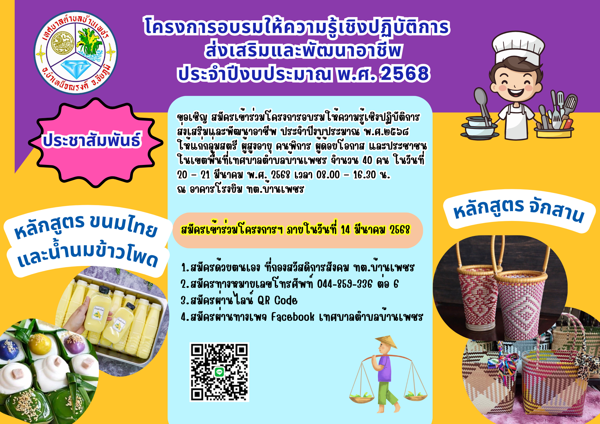 รายละเอียด : ประชาสัมพันธ์ ขอเชิญสมัครเข้าร่วมโครงการอบรมให้ความรู้เชิงปฏิบัติการ ส่งเสริมและพัฒนาอาชีพ ประจำปีงบประมาณ พ.ศ.๒๕๖๘ ให้แก่กลุ่มสตรี ผู้สูงอายุ คนพิการ ผู้ด้อยโอกาส และประชาชนในเขตพื้นที่เทศบาลตำบลบ้านเพชร จำนวน 40 คน ในวันที่ 20 – 21 มีนาคม พ.ศ. 2568 เวลา 08.00 – 16.30 น.