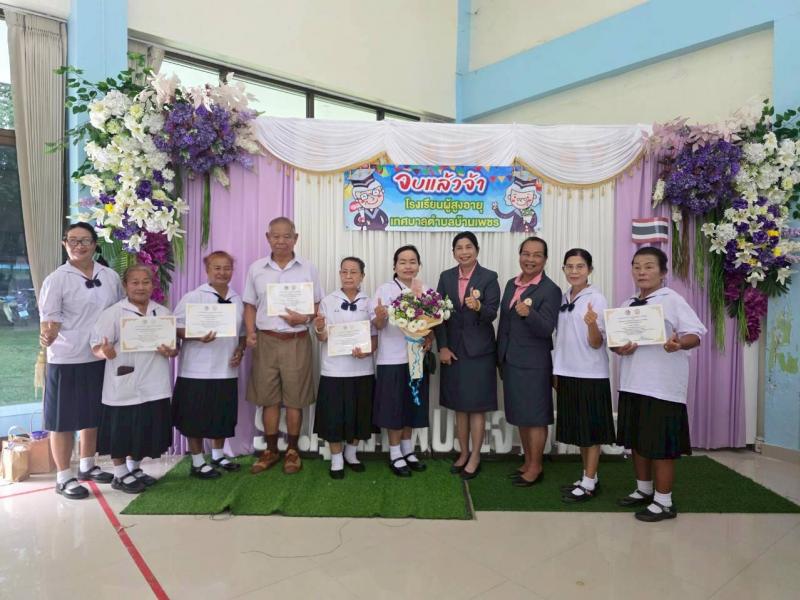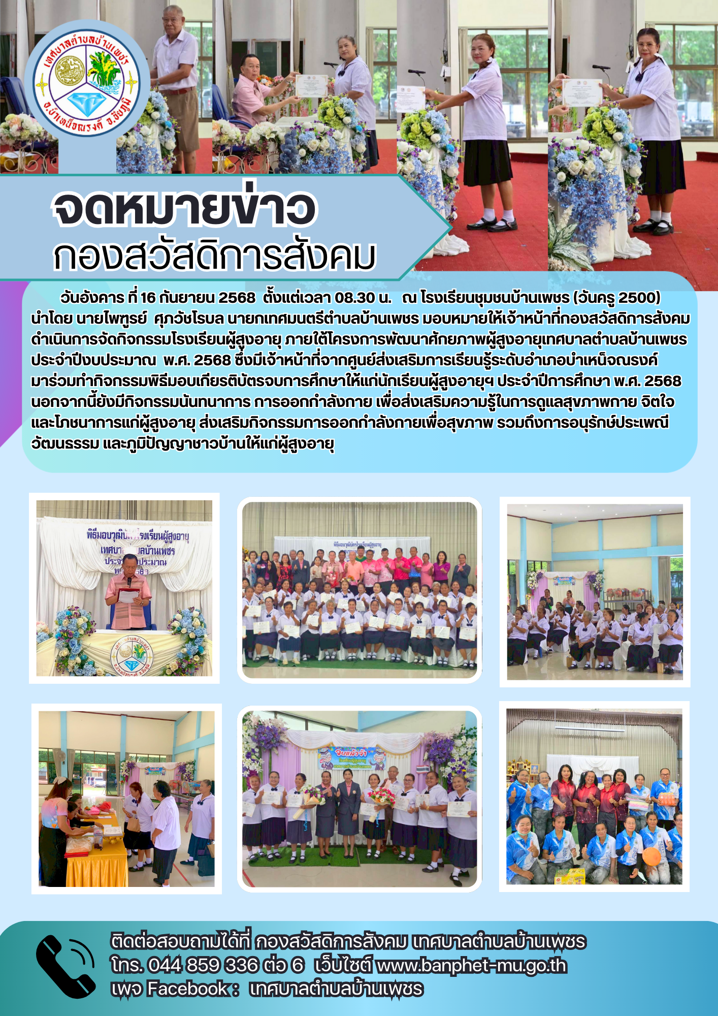 รายละเอียด : วันอังคาร ที่ 16 กันยายน 2568 ตั้งแต่เวลา 08.30 น. ณ โรงเรียนชุมชนบ้านเพชร (วันครู 2500) นำโดย นายไพฑูรย์ ศุภวัชโรบล นายกเทศมนตรีตำบลบ้านเพชร มอบหมายให้กองสวัสดิการสังคม ดำเนินการจัดกิจกรรมโรงเรียนผู้สูงอายุ ภายใต้โครงการพัฒนาศักยภาพผู้สูงอายุเทศบาลตำบลบ้านเพชร ประจำปีงบประมาณ พ.ศ. 2568 โดยร่วมกับเจ้าหน้าที่จากศูนย์ส่งเสริมการเรียนรู้ระดับอำเภอบำเหน็จณรงค์ มาร่วมทำกิจกรรม ภายในงาน ช่วงเช้ามีพิธีมอบเกียรติบัตรจบการศึกษาให้แก่นักเรียนผู้สูงอายุฯ ประจำปีการศึกษา พ.ศ. 2568 และช่วงบ่ายมีกิจกรรมนันทนาการ การออกกำลังกาย เพื่อส่งเสริมความรู้ในการดูแลสุขภาพกาย จิตใจ และโภชนาการแก่ผู้สูงอายุ ส่งเสริมกิจกรรมการออกกำลังกายเพื่อสุขภาพ รวมถึงการอนุรักษ์ประเพณี วัฒนธรรม และภูมิปัญญาชาวบ้านให้แก่ผู้สูงอายุ