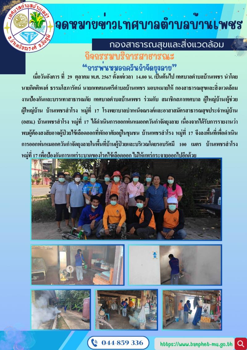 รายละเอียด : เมื่อวันอังคาร ที่ 29 ตุลาคม พ.ศ. 2567 ตั้งแต่เวลา 14.00 น. เป็นต้นไป เทศบาลตำบลบ้านเพชร นำโดย นายกิตติพงศ์ ธรรมโสภารัตน์ นายกเทศมนตรีตำบลบ้านเพชร มอบหมายให้ กองสาธารณสุขและสิ่งแวดล้อม งานป้องกันและบรรเทาสาธารณภัย เทศบาลตำบลบ้านเพชร ร่วมกับ สมาชิกสภาเทศบาล ผู้ใหญ่บ้าน/ผู้ช่วยผู้ใหญ่บ้าน บ้านเพชรสำโรง หมู่ที่ 17 โรงพยาบาลบำเหน็จณรงค์และอาสาสมัครสาธารณสุขประจำหมู่บ้าน (อสม.) บ้านเพชรสำโรง หมู่ที่ 17 ได้ดำเนินการออกพ่นหมอกควันกำจัดยุงลาย เนื่องจากได้รับการรายงานว่า พบผู้ต้องสงสัยอาจผู้ป่วยไข้เลือดออกที่พักอาศัยอยู่ในชุมชน บ้านเพชรสำโรง หมู่ที่ 17 จึงลงพื้นที่เพื่อดำเนินการออกพ่นหมอกควันกำจัดยุงลายในพื้นที่บ้านผู้ป่วยและบริเวณโดยรอบรัศมี 100 เมตร บ้านเพชรสำโรง หมู่ที่ 17 เพื่อป้องกันการแพร่ระบาดของโรคไข้เลือดออก ไม่ให้แพร่กระจายออกไปอีกด้วย