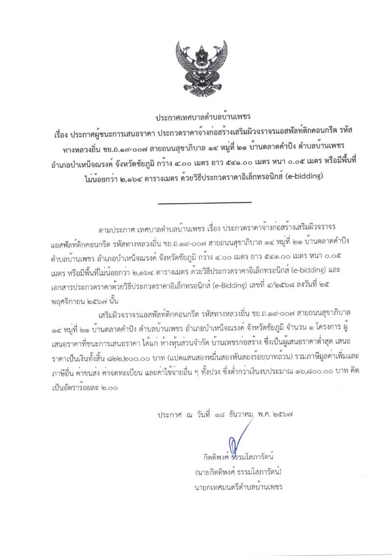 โครงการเงินอุดหนุนเฉพาะกิจ ประจำปีงบประมาณ พ.ศ.2568 ด้านโครงสร้างพื้นฐาน ปรับปรุงถนนเสริมผิวจราจรแอสฟัลท์ติกคอนกรีต รหัสทางหลวงถิ่น ชย.ถ.19-007 สายถนนสุขาภิบาล 14 หมู่ที่ 21