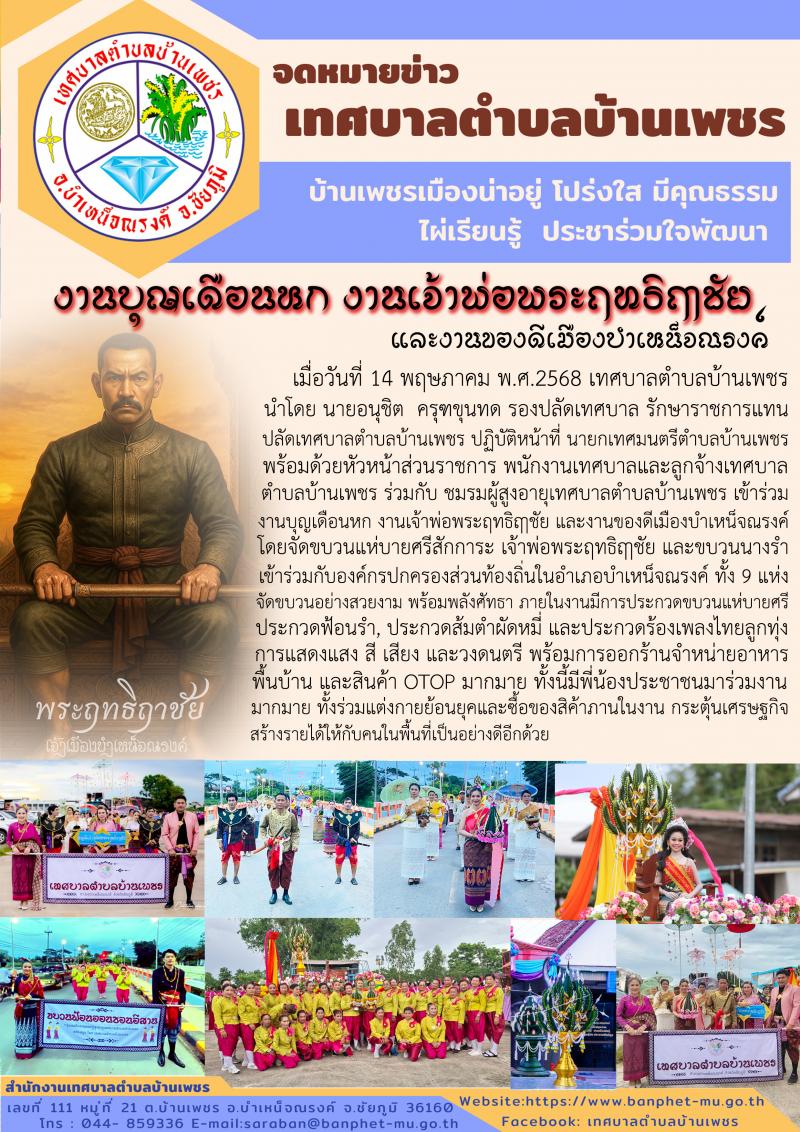 รายละเอียด : เมื่อวันที่ 14 พฤษภาคม 2568 เทศบาลตำบลบ้านเพชร นำโดย นายอนุชิต ครุฑขุนทด รองปลัดเทศบาล รักษาราชการแทนปลัดเทศบาลตำบลบ้านเพชร ปฏิบัติหน้าที่ นายกเทศมนตรีตำบลบ้านเพชร พร้อมด้วยหัวหน้าส่วนราชการ พนักงานเทศบาล ลูกจ้างเทศบาลตำบลบ้านเพชร ร่วมกับ ชมรมผู้สูงอายุเทศบาลตำบลบ้านเพชร เข้าร่วมงานบุญเดือน6 งานเข้าพ่อพระฤทธิฤๅชัย และงานของดีอำเภอบำเหน็จณรงค์ ประจำปี 2568 โดยจัดขบวนแห่บายศรีสักการะเจ้าพ่อพระฤทธิฤๅชัย และขบวนนางรำกว่า 30 คน ร่วมกับองค์กรปกครองส่วนท้องถิ่น ที่ 8 แห่งในอำเภอบำเหน็จณรงค์ ด้วยพลังศรัทธา เจ้าพ่อพระฤทธิฤๅชัย พ่อเมืองบำเหน็จณรงค์คนแรก ในงานมีการประกวดขบวนแห่บายศรี, ประกวดฟ้อนรำ, แข่งขันส้มตำ-ผัดหมี่, ประกวดร้องเพลง, การแสดงแสง สี เสียง, การรำบวงสรวง, การออกร้านจำหน่ายอาหาร และการแสดงดนตรี โดยมีพี่น้องประชาชนมาร่วมงานมากกมาย สร้างการกระตุ้นเศรษฐกิจ สร้างรายได้ให้กับคนในพื้นที่อีกด้วย
