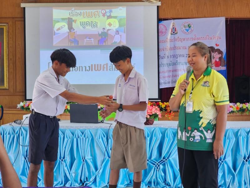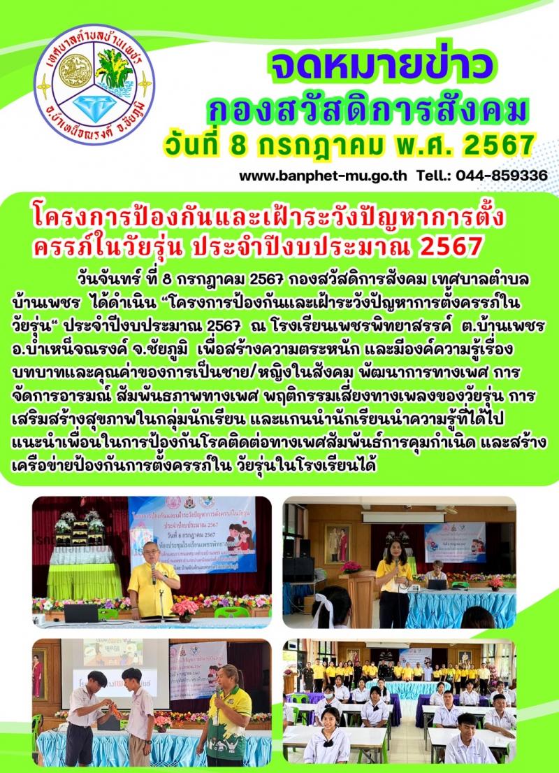รายละเอียด : วันที่ 8 กรกฎาคม พ.ศ. 2567 ตั้งแต่เวลา 09.00 น . เทศบาลตำบลบ้านเพชร นำโดย นายกิตติพงศ์ ธรรมโสภารัตน์ นายกเทศมนตรีตำบลบ้านเพชร คณะผู้บริหาร สมาชิกสภาเทศบาล มอบหมายให้ กองสวัสดิการสังคมเทศบาลตำบลบ้านเพชร ได้ดำเนิน “โครงการป้องกันและเฝ้าระวังปัญหาการตั้งครรภ์ในวัยรุ่น“ ประจำปีงบประมาณ 2567 ณ โรงเรียนเพชรพิทยาสรรค์ ต.บ้านเพชร อ.บำเหน็จณรงค์ จ.ชัยภูมิ เพื่อสร้างความตระหนัก และมีองค์ความรู้เรื่องบทบาทและคุณค่าของการเป็นชาย/หญิงในสังคม พัฒนาการทางเพศ การจัดการอารมณ์ สัมพันธภาพทางเพศ พฤติกรรมเสี่ยงทางเพลงของวัยรุ่น การเสริมสร้างสุขภาพในกลุ่มนักเรียน และแกนนำนักเรียนนำความรู้ที่ได้ไปแนะนำเพื่อนในการป้องกันโรคติดต่อทางเพศสัมพันธ์การคุมกำเนิด และสร้างเครือข่ายป้องกันการตั้งครรภ์ใน วัยรุ่นในโรงเรียนได้
