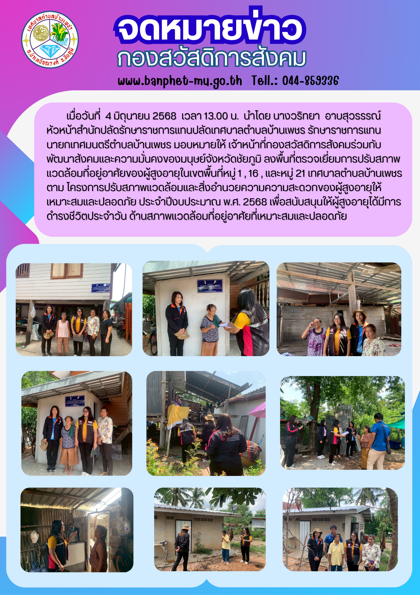 รายละเอียด : เมื่อวันที่ 4 มิถุนายน 2568 เวลา 13.00 น. นำโดย นางวริทยา อาบสุวรรรณ์ หัวหน้าสำนักปลัดรักษาราชการแทนปลัดเทศบาลตำบลบ้านเพชร รักษาราชการแทน นายกเทศมนตรีตำบลบ้านเพชร มอบหมายให้ เจ้าหน้าที่กองสวัสดิการสังคมร่วมกับพัฒนาสังคมและความมั่นคงของมนุษย์จังหวัดชัยภูมิ ลงพื้นที่ตรวจเยี่ยมการปรับสภาพแวดล้อมที่อยู่อาศัยของผู้สูงอายุในเขตพื้นที่หมู่ 1 , 16 , และหมู่ 21 เทศบาลตำบลบ้านเพชร