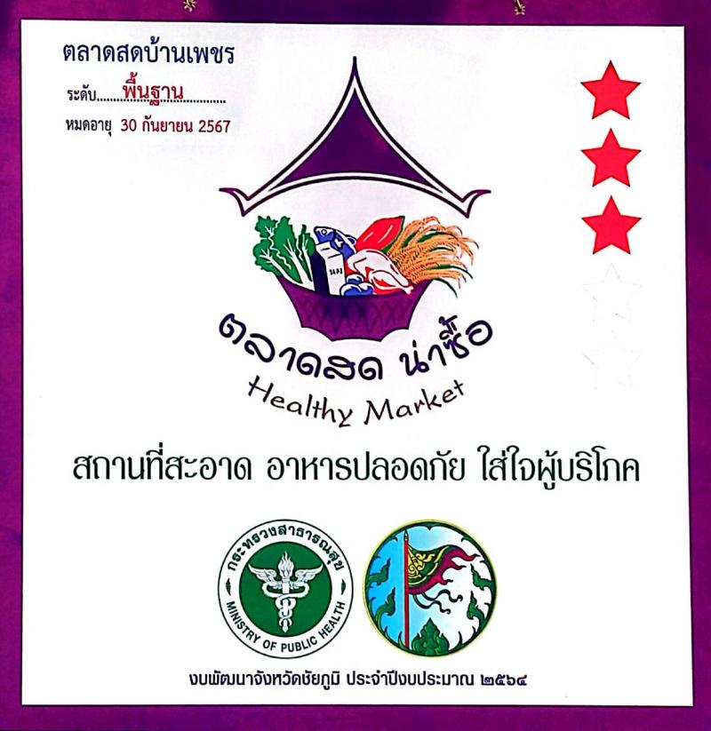 รายละเอียด : วันที่ 27 ตุลาคม 2566 ณ ศาลากลางจังหวัดชัยภูมิ พิธีมอบป้ายผลการประเมินรับรองตามเกณฑ์มาตรฐาน ระดับพื้นฐาน "ตลาดสดน่าซื้อ วิถีใหม่" จังหวัดชัยภูมิ ประจำปี 2566 โดย กระทรวงสาธารณสุข และจังหวัดชัยภูมิ ให้แก่เทศบาลตำบลบ้านเพชร ที่มีผลการจัดการ สถานที่สะอาด อาหารปลอดภัย ใส่ใจผู้บริโภค มีเป้าหมายเพื่อให้เกิด การปรับปรุงพัฒนายกระดับตลาดสดของไทย ให้เป็นไปตามเกณฑ์มาตรฐาน ที่ถูกต้องตามหลักการสุขาภิบาลและถูกสุขลักษณะ เพื่อให้ประชาชนมีแหล่งซื้อ วัตถุดิบและอาหารที่สะอาด ปลอดภัย ไม่ก่อโรค ซึ่งได้แบ่งเกณฑ์มาตรฐานเป็น 4 ด้าน ได้แก่ 1. ด้านสุขาภิบาลสิ่งแวดล้อม (Environmental Health) 41 ข้อ 2. ด้านสุขอนามัยส่วนบุคคล (Personal Hygiene) 5 ข้อ 3. ด้านความปลอดภัยอาหาร (Food Safety) 2 ข้อ 4. ด้านการคุ้มครองผู้บริโภค (Consumer Protection) 2 ข้อ