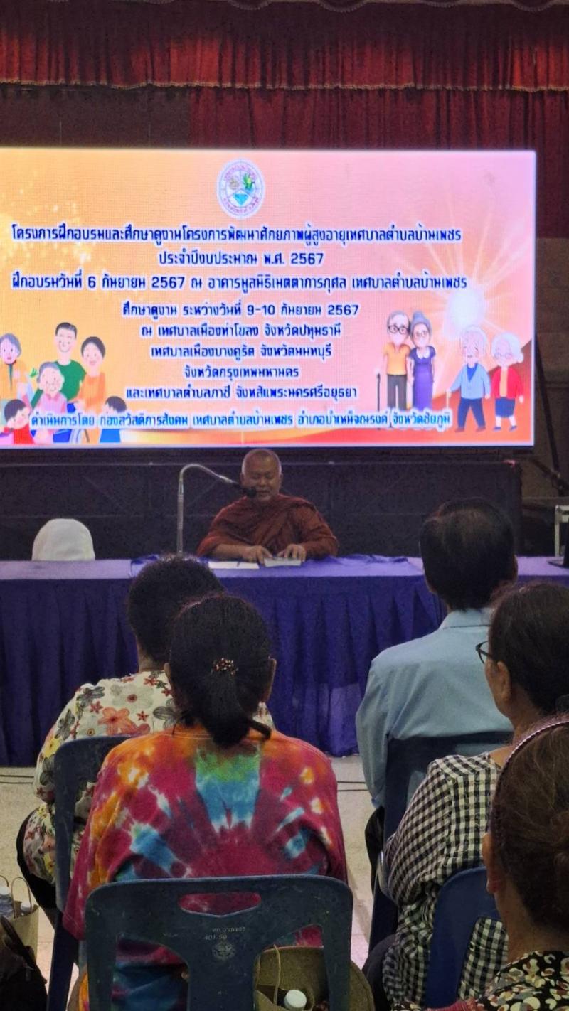 เมื่อวันที่ 6 กันยายน 2567 ตั้งแต่เวลา 08.30 น. เทศบาลตำบลบ้านเพชร นำโดย นายกิตติพงศ์ ธรรมโสภารัตน์ นายกเทศมนตรีตำบลบ้านเพชร มอบหมายให้กองสวัสดิการสังคมเทศบาลตำบลบ้านเพชร ดำเนินโครงการพัฒนาศักยภาพผู้สูงอายุ ประจำปีงบประมาณ 2567 โดยได้รับเมตตาจาก พระครูสุนทรชัยวัฒน์ เจ้าคณะอำเภอบำเหน็จณรงค์ (ธรรมยุต) บรรยายธรรม ในหัวข้อธรรมะสำหรับผู้สูงอายุ และร่วมกับทีมวิทยากรจากโรงพยาบาลบำเหน็จณรงค์ ได้มีให้ความรู้ เรื่องเกี่ยวกับการเตรียมความพร้อมเข้าสู่วัยผู้สูงอายุและการออกกำลังกายสำหรับผู้สูงอายุ ทั้งนี้โดยมีผู้เข้าร่วมอบรมจำนวน 50 คน ซึ่งทุกคนต่างได้รับทราบข้อมูลการดูแลตนเอง ทั้งสุขภาพทางกายและทางใจ พร้อมทั้งสนุกสนานกับกิจกรรมเป็นอย่างมาก