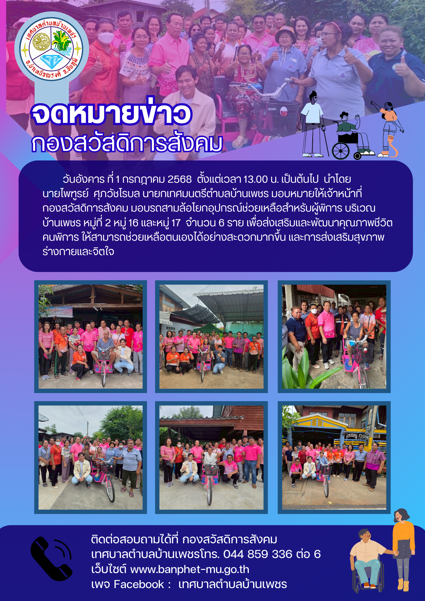 วันอังคาร ที่ 1 กรกฎาคม 2568 ตั้งแต่เวลา 13.00 น. เป็นต้นไป เทศบาลตำบลบ้านเพชร นำโดย นายไพฑูรย์ ศุภวัชโรบล นายกเทศมนตรีตำบลบ้านเพชร มอบหมายให้กองสวัสดิการสังคม มอบรถสามล้อโยกอุปกรณ์ช่วยเหลือสำหรับผู้พิการ บริเวณบ้านเพชร หมู่ที่ 2 หมู่ 16 และหมู่ 17 จำนวน 6 ราย เพื่อส่งเสริมและพัฒนาคุณภาพชีวิตคนพิการ ให้สามารถช่วยเหลือตนเองได้อย่างสะดวกมากขึ้น และการส่งเสริมสุขภาพร่างกายและจิตใจ
