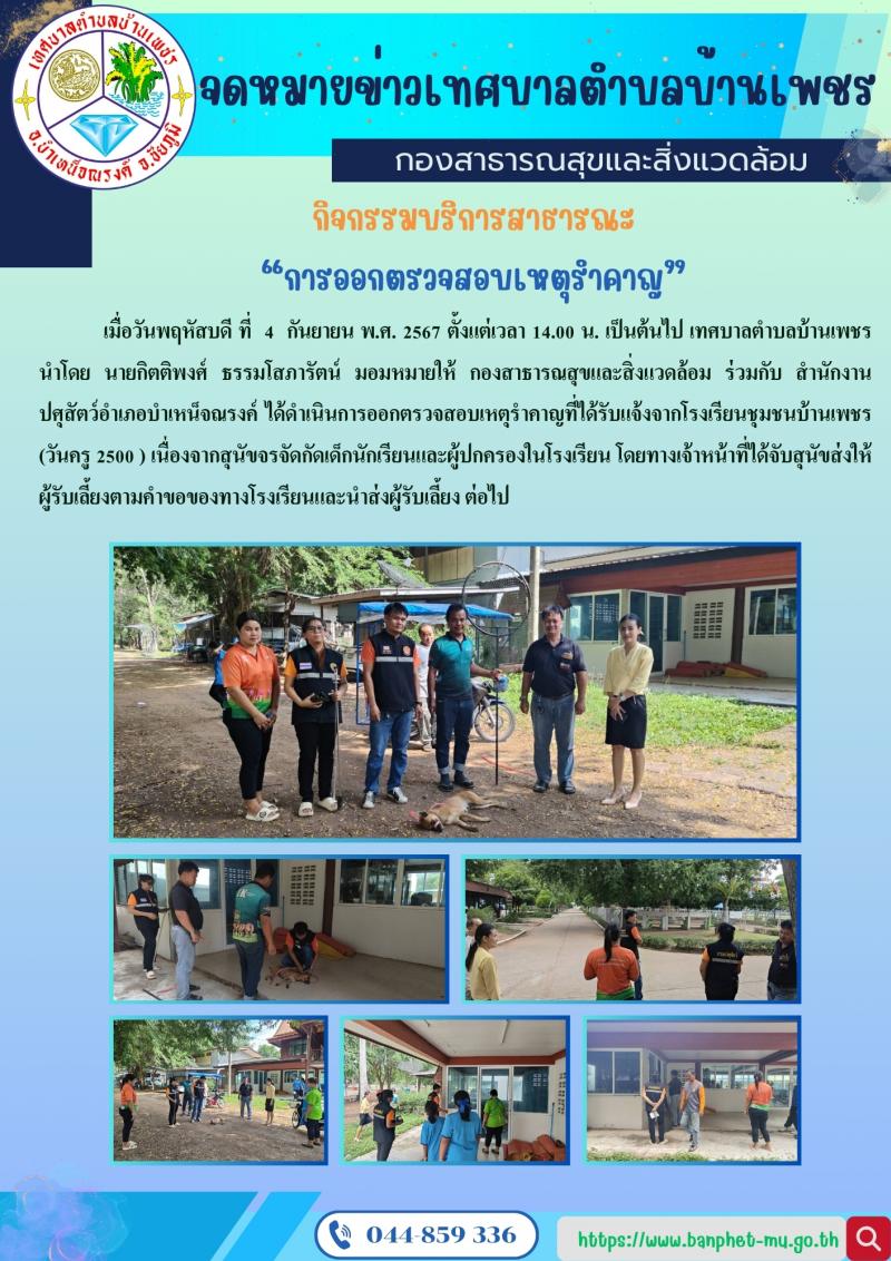 รายละเอียด : กิจกรรมบริการสาธารณะ “การออกตรวจสอบเหตุรำคาญ” -- เมื่อวันพฤหัสบดี ที่ 4 กันยายน พ.ศ. 2567 ตั้งแต่เวลา 14.00 น. เป็นต้นไป เทศบาลตำบลบ้านเพชร นำโดย นายกิตติพงศ์ ธรรมโสภารัตน์ มอมหมายให้ กองสาธารณสุขและสิ่งแวดล้อม ร่วมกับ สำนักงานปศุสัตว์อำเภอบำเหน็จณรงค์ ได้ดำเนินการออกตรวจสอบเหตุรำคาญที่ได้รับแจ้งจากโรงเรียนชุมชนบ้านเพชร (วันครู 2500 ) เนื่องจากสุนัขจรจัดกัดเด็กนักเรียนและผู้ปกครองในโรงเรียน โดยทางเจ้าหน้าที่ได้จับสุนัขส่งให้ผู้รับเลี้ยงตามคำขอของทางโรงเรียนและนำส่งผู้รับเลี้ยง ต่อไป