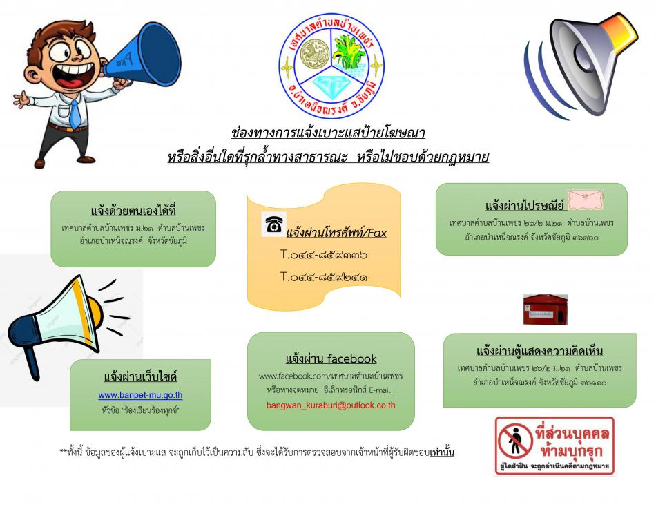 ช่องทางการแจ้งเบาะแสป้ายโฆษณา หรือสิ่งอื่นใดที่รุกล้ำทางสาธารณะ หรือไม่ชอบด้วยกฎหมาย [3 ธันวาคม 2565]