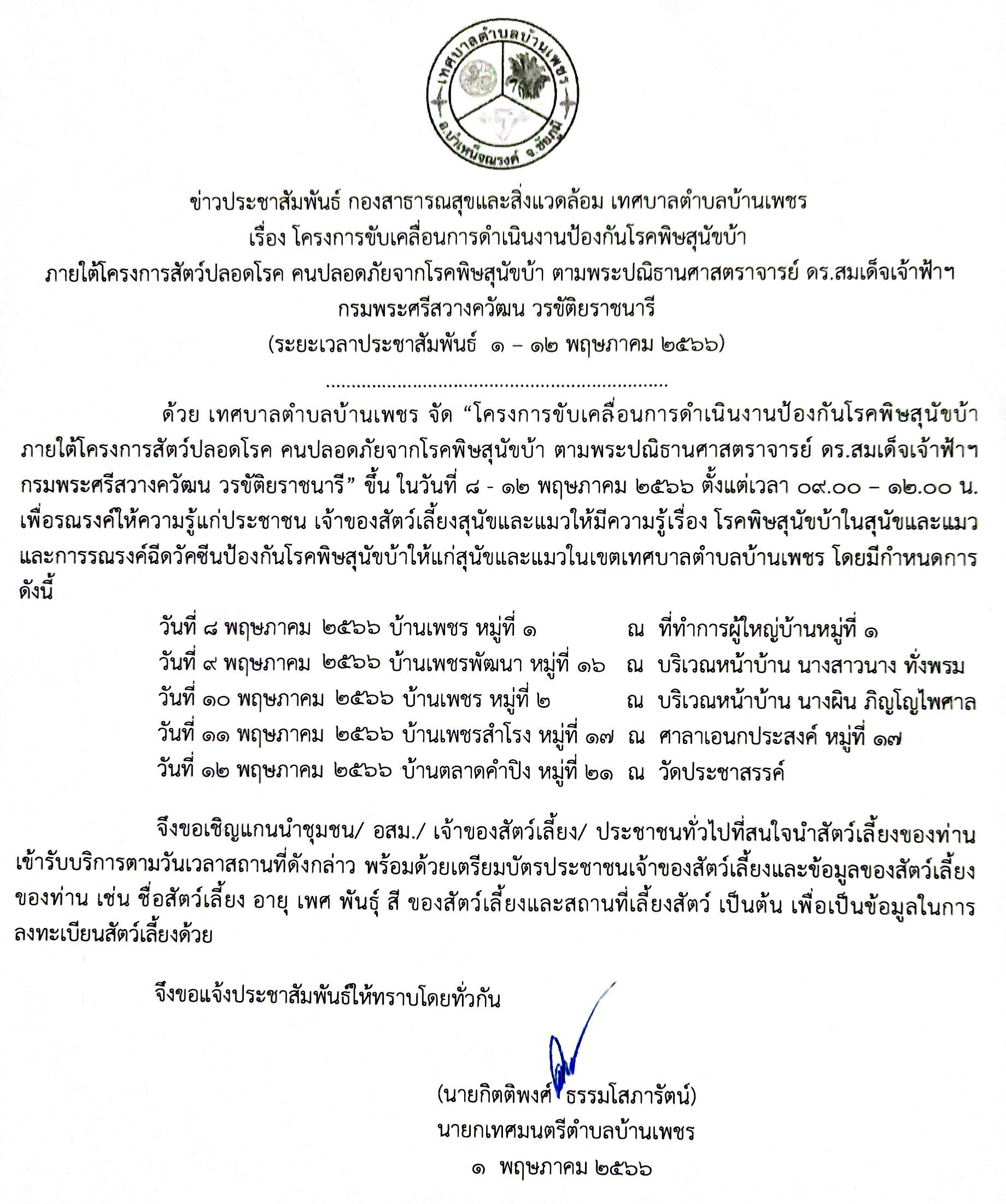 รายละเอียด : เทศบาลตำบลบ้านเพชร จัด “โครงการขับเคลื่อนการดำเนินงานป้องกันโรคพิษสุนัขบ้าภายใต้โครงการสัตว์ปลอดโรค คนปลอดภัยจากโรคพิษสุนัขบ้า ตามพระปณิธานศาสตราจารย์ ดร.สมเด็จเจ้าฟ้าฯ กรมพระศรีสวางควัฒน วรขัติยราชนารี” ขึ้น ในวันที่ ๘ - ๑๒ พฤษภาคม ๒๕๖๖ ตั้งแต่เวลา ๐๙.๐๐ – ๑๒.๐๐ น. เพื่อรณรงค์ให้ความรู้แก่ประชาชน เจ้าของสัตว์เลี้ยงสุนัขและแมวให้มีความรู้เรื่อง โรคพิษสุนัขบ้าในสุนัขและแมว และการรณรงค์ฉีดวัคซีนป้องกันโรคพิษสุนัขบ้าให้แก่สุนัขและแมวในเขตเทศบาลตำบลบ้านเพชร โดยมีกำหนดการ ดังนี้