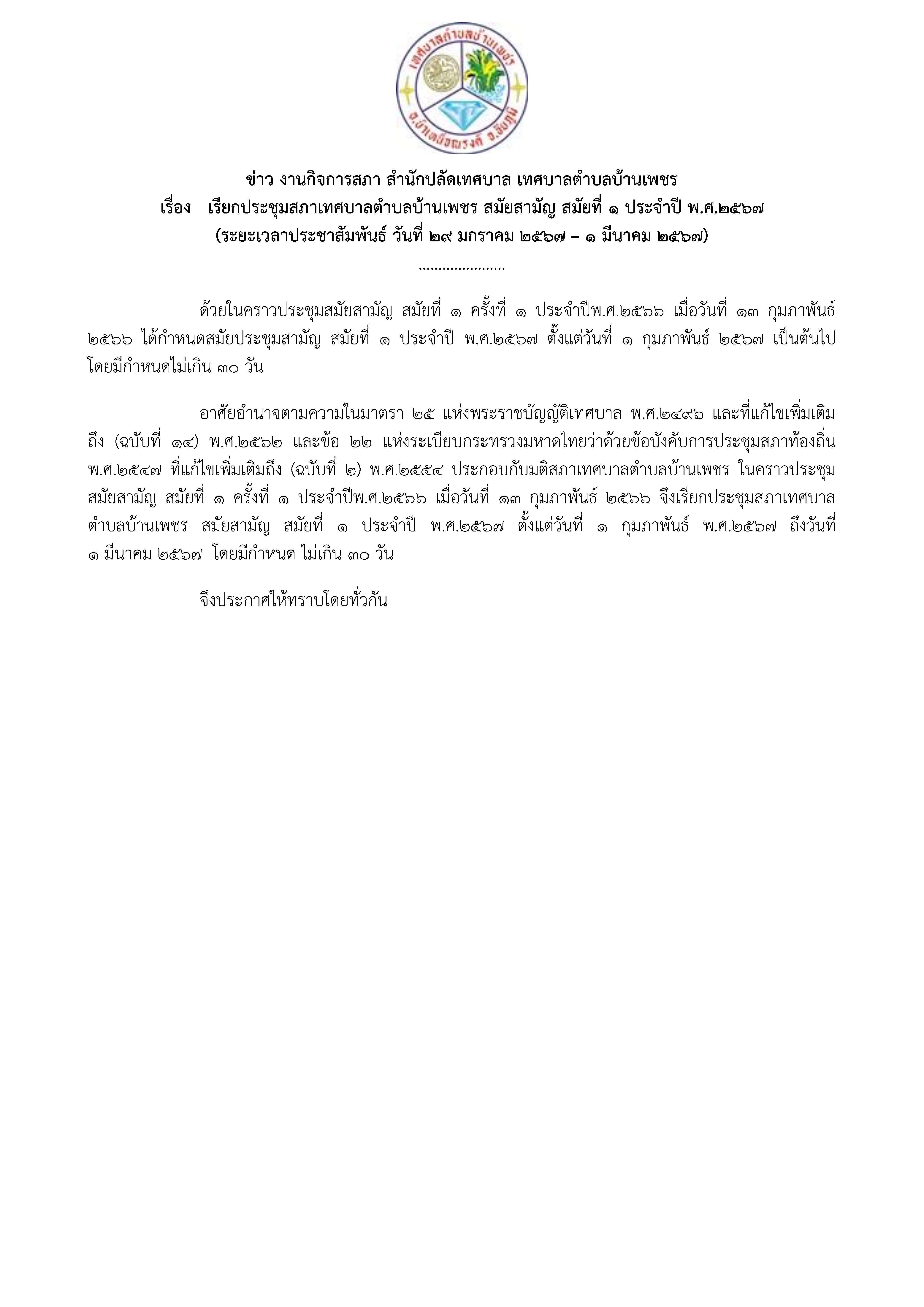 การเรียกประชุมสภาเทศบาลตำบลบ้านเพชร สมัยสามัญ สมัยที่ 1 ประจำปีพ.ศ.2567