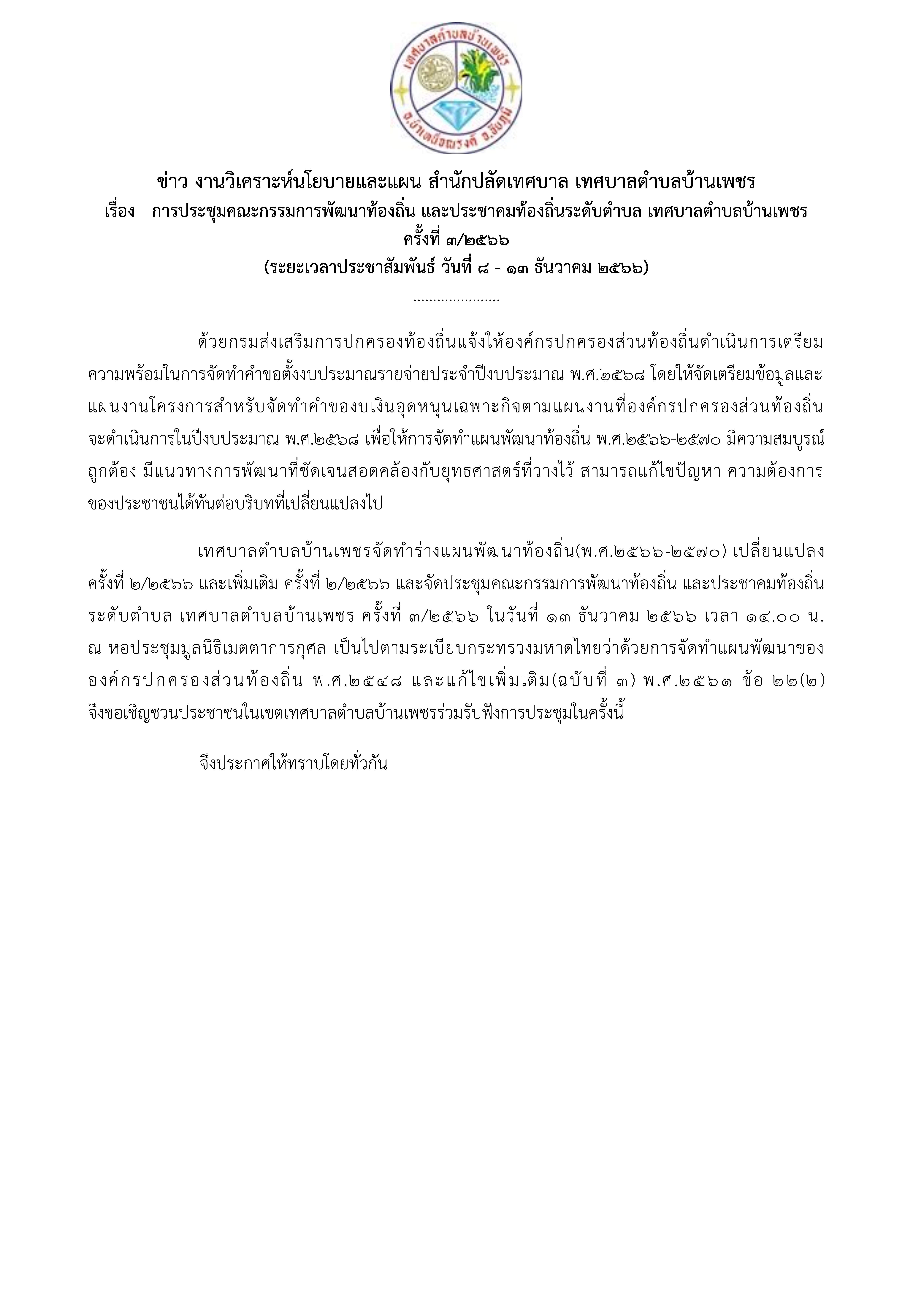 การประชุมคณะกรรมการพัฒนาท้องถิ่น และประชาคมท้องถิ่นระดับตำบล เทศบาลตำบลบ้านเพชร ครั้งที่ 3/2566