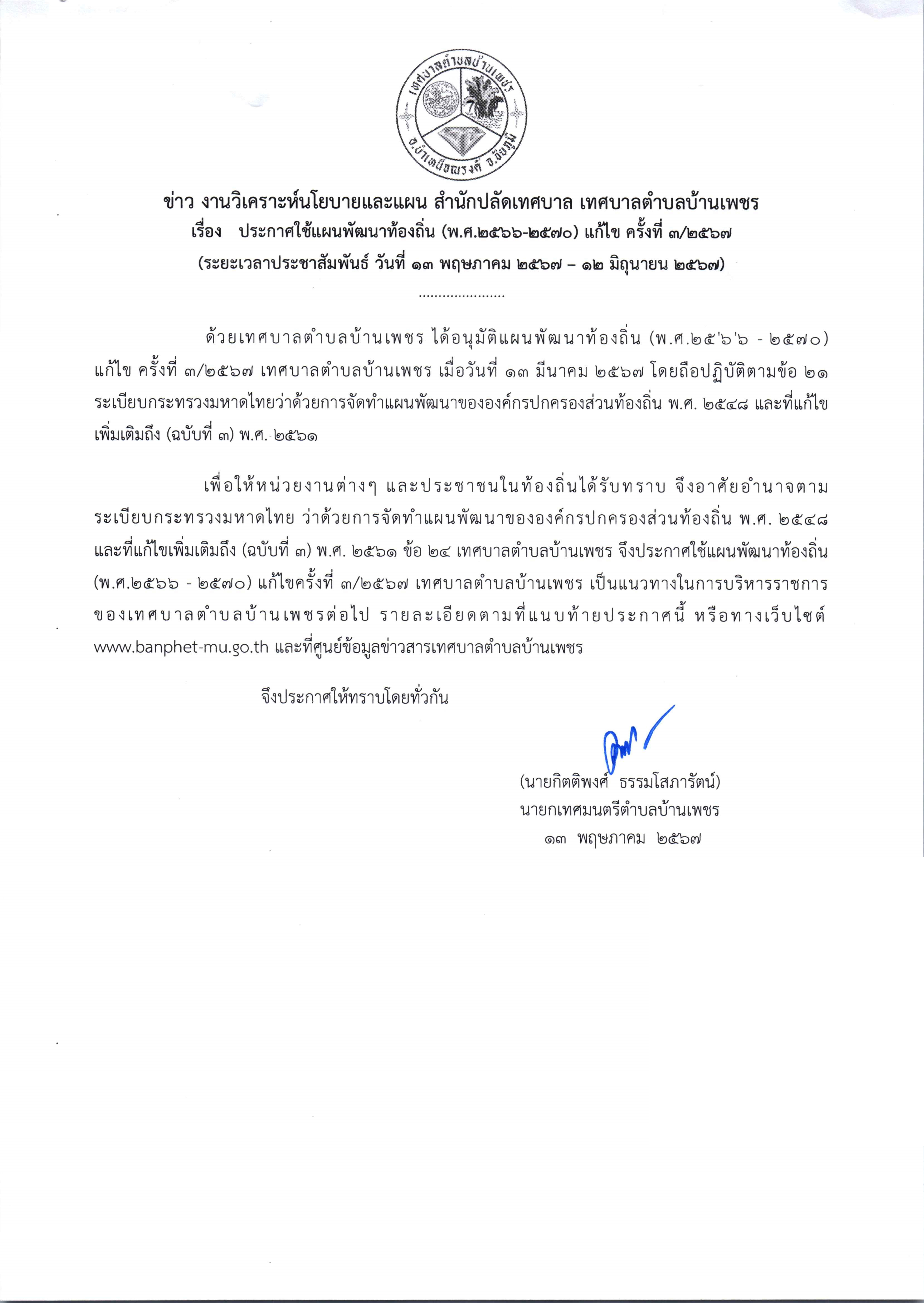 ประกาศใช้แผนพัฒนาท้องถิ่น (พ.ศ.2566-2570) แก้ไข ครั้งที่ 3/2567