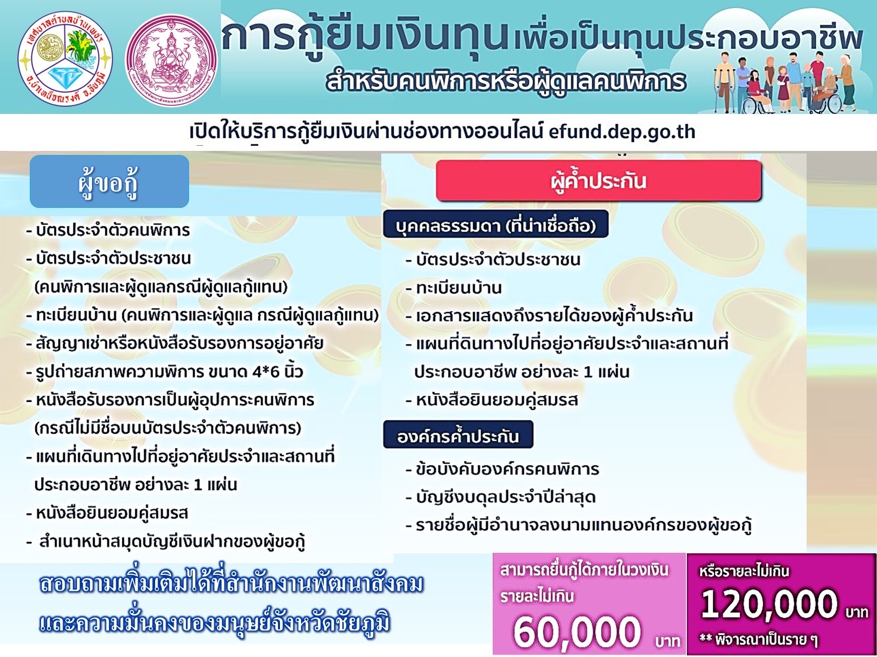 ประชาสัมพันธ์ การกู้ยืมเงินทุนเพื่อเป็นทุนประกอบอาชีพสำหรับคนพิการหรือผู้ดูแลคนพิการ